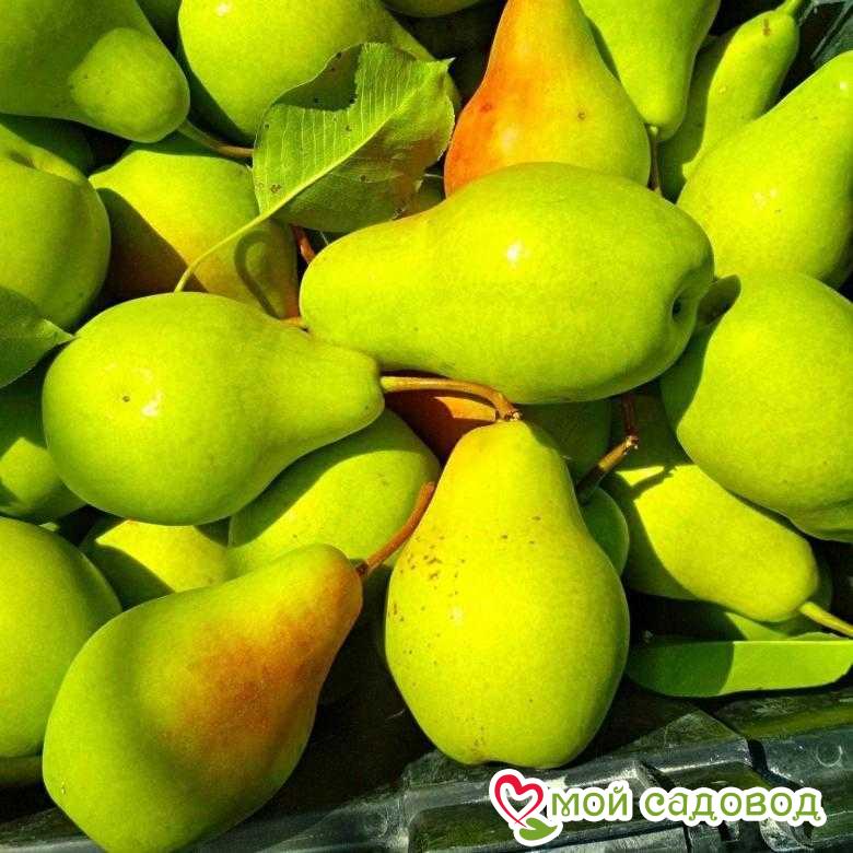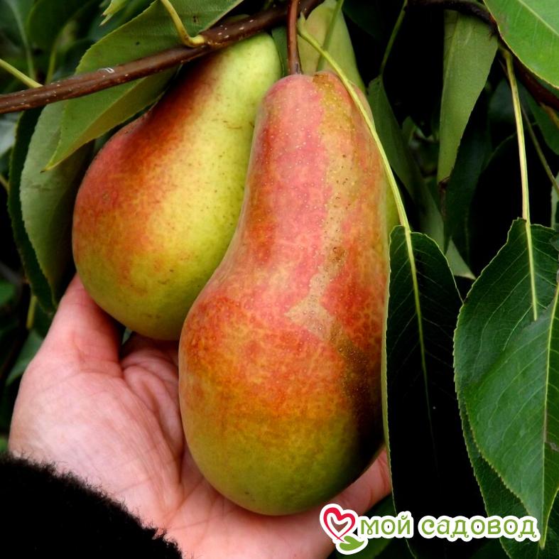 Преобладающий тип плодовых образований – кольчатки. Побеги средней толщины, прямые, неопушенные, коричневого цвета. Чечевичек много, средней величины, хорошо заметные. Почки крупные, конической формы, неопушенные, прижатые. Листья крупные, яйцевидной формы, длиннозаостренные, темно-зеленые, гладкие, блестящие, с нежной нервацией. Цветение в средние сроки.  Плоды выше средней величины (масса 170 г), удлиненно-грушевидной, бутылочной формы, у вершины иногда скошенные. Кожица гладкая, блестящая, маслянистая, светло-желтая с ярким красно-карминовым румянцем на солнечной стороне на большей половине плода. Подкожных точек много, мелкие, на неокрашенной части плода зеленые, на освещенной стороне белые, хорошо заметные. Мякоть кремовая, средней плотности, хрустящая, мелкозернистая, очень сочная, сладкая, хорошего вкуса. Съемная зрелость плодов наступает в конце сентября, потребительская в октябре–ноябре. Лежкость плодов хорошая, в хранилищах с искусственным охлаждением до декабря, во время хранения не образуют пятен. Поздний съем для этого сорта нежелателен. Плоды прочно держатся на дереве, устойчивы к нажимам. Плодоносят обильно и ежегодно. Транспортабельность плодов хорошая. Зимостойкость и засухоустойчивость деревьев довольно высокая. Характеризуется высокой устойчивостью к грибным болезням. В нашем интернет-магазине вы сможете купить Саженцы груши Так же возможно вас заинтересуют Саженцы вишни — Чудо-вишня и Вишня Шалунья .