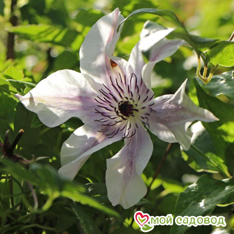 Листья и молодые побеги лианы бордово-красного цвета. Цветение длительное и обильное, на побегах текущего года. Начинается этот период в июне и заканчивается в сентябре. Цветки звездообразной формы, состоящие из 6 чашелистиков. Диаметр полностью раскрывшегося бутончика равен 8 – 9 см. Лепестки имеют эллиптическую форму. Длина их равна 5 – 6 см, а ширина – 4 см. Окрас – белый, с нежным лиловым оттенком. Центральные полоски светло-фиолетовые. Тычинки пурпурные. Аромат тонкий и приятный.