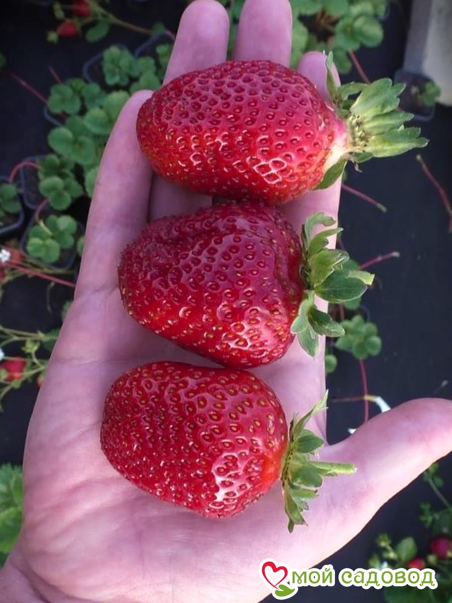 Читать далееКлубника Диамант ремонтантная — крупноплодный сорт нейтрального светового дня, с крупными, удлиненными блестящими ягодами оранжево-красного цвета. Средний вес ягоды, при высокой агротехнике, достигает 30-32 г. Спелые плоды плотные, не слишком сочные, с высокими показателями сахаристости. Цвет мякоти достаточно светлый, поэтому ягоды этого сорта для переработки используются нечасто. Сорт пригоден для транспортировки на большие расстояния. Сорт формирует относительно высокорослые мощные кусты с хорошо развитой листовой розеткой. Соцветия размещаются строго над листьями. Сорт обладает высокой устойчивостью к поражению паутинным клещом, милдью, белой и красной пятнистостью листьев. На фазе активного плодоношения растения наблюдается выраженное формирование усов. Сорт можно выращивать как в открытом грунте, так и в контейнерах или кашпо.