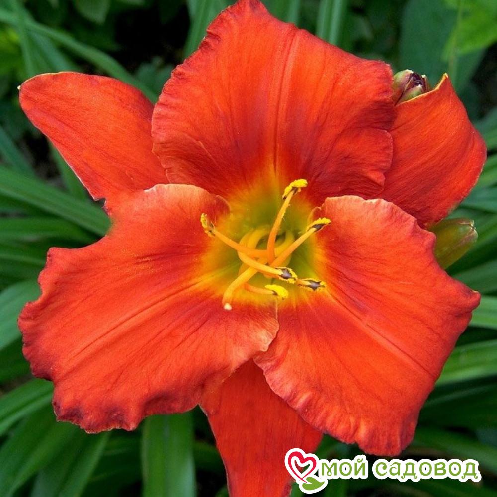 Сочный сорт наполняет летний сад приятным ароматом и жизненной энергией. Оранжево-красный цветок украшен лимонно-желтым горлом и едва заметным глазком. Последний на пару тонов светлее основного окраса. В центре просматриваются длинные желтые нити с оранжевыми пыльниками. Лепестки округлой формы. По краям они слегка рифленые. В полном роспуске диаметр цветка равен 14 – 15 см. Период цветения наступает в последних числах июля и длится довольно долго. Возможно даже повторное цветение.