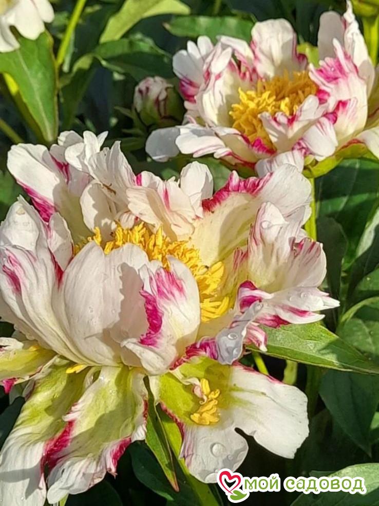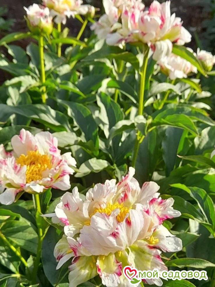 Читать далееПион Твиттерпэйтэд — Цветок диаметром 10-15 см, нежно-розовый или кремовый с вишневыми или малиново-красными нерегулярными полосами и штрихами. В центре золотисто-жёлтые тычинки. Листва светло-зелёная. Стебли с двумя бутонами. Высота 80-90 см. Срок цветения ранний.