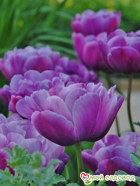 Блю Даймонд — данный сорт выделяется роскошной окраской с переходами от нежно-сиреневого тона к оттенкам королевского пурпура. Густо-махровый бокал цветка поддерживает прочный цветонос, стебель поднимается до 60 см, яркие листья образуют красивую розетку. Роскошный, эффектный сорт редкой окраски. Иметь такой тюльпан на участке – счастье. Во время цветения бокал цветка открывается постепенно, принимая форму розы, затем – пиона.