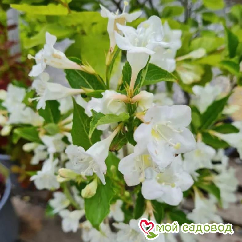 Вейгела «Бристол Сноуфлейк» — красивоцветущий кустарник, высотой и шириной до 1,5 м. Крона более вертикальная. Листья длинные, зеленые. В мае-июне куст полностью покрывается белыми крупными колокольчатыми цветками, размер которых достигает 3 см. Цветение позднее, продолжительное. В это время вейгела смотрится элегантно и одновременно трогательно. Место по возможности должно быть солнечное, защищено от ветра. Сорт склонен к повторному цветению. Уход за растением:  Саженцы вейгелы нужно сажать в плодородную, воздухопроницаемую почву. Сразу учитывайте, что место постоянное, так как пересадить массивный куст с пышной кроной даже при желании будет практически невозможно. Для того, чтобы растение выглядело аккуратно, его нужно стричь, удаляя больные и поврежденные ветки и формируя крону так, как вам это нужно. В первый сезон кустарник нуждается в регулярном поливе, затем вейгелу поливают только при длительных засухах.