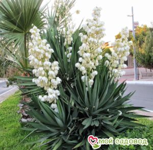 Куст вырастает пышным и раскидистым. Цветоносы сине-зеленые, высотой 1,5 – 2 м. Листья у юкки плотные, длинные, заостренной формы. Цветки образуются в большом количестве, колокольчатой формы, диаметром около 6 см. Лепестки широкие и овальные, окрашенные в белый цвет.